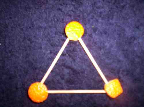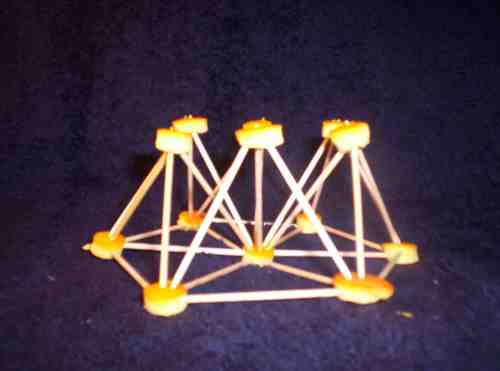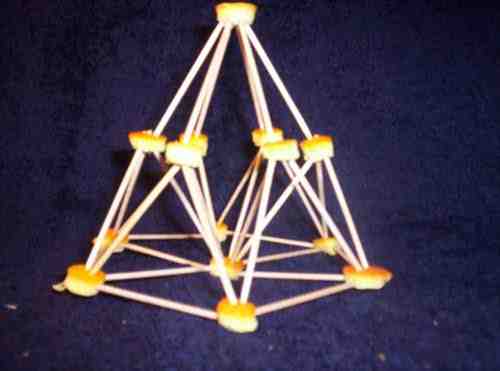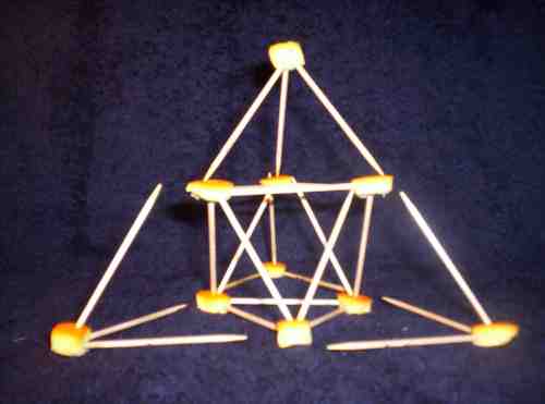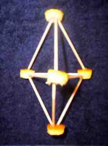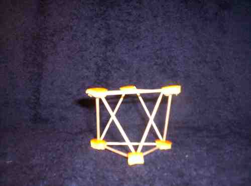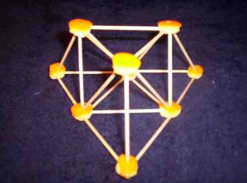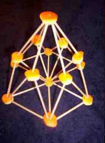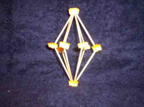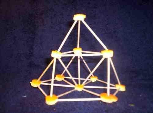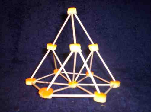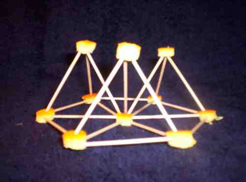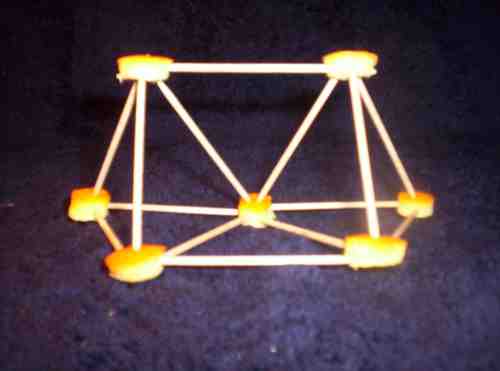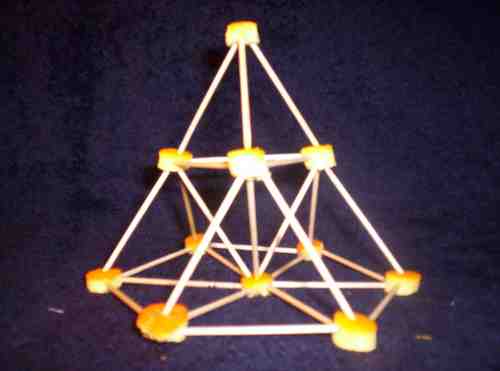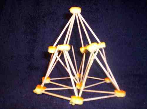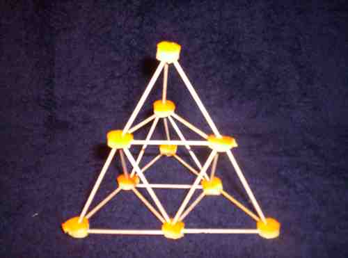 La dipiramide triangolare si trova al centro del solido costruito: una base esagonale regolare con divisa in 6 triangoli equilateri, su tre dei quali, distanziati da un triangolo l'uno dall'altro, ci sono altrettanti tetraedri. Anche qua le prime 3 foto mancano della punta.