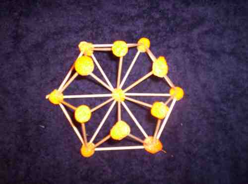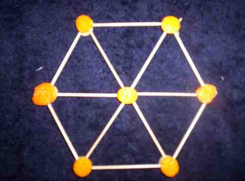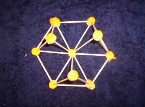 La prima foto mostra la base esagonale del solido. La seconda mostra i tetraedri di base gia' costruiti, che nella terza vediamo dall'alto.