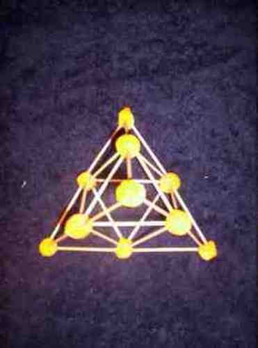 Qua il tetraedro di tetraedri e' completo: ovviamente il lato del tetraedro e' il doppio del lato dei tetraedri che lo compongono.