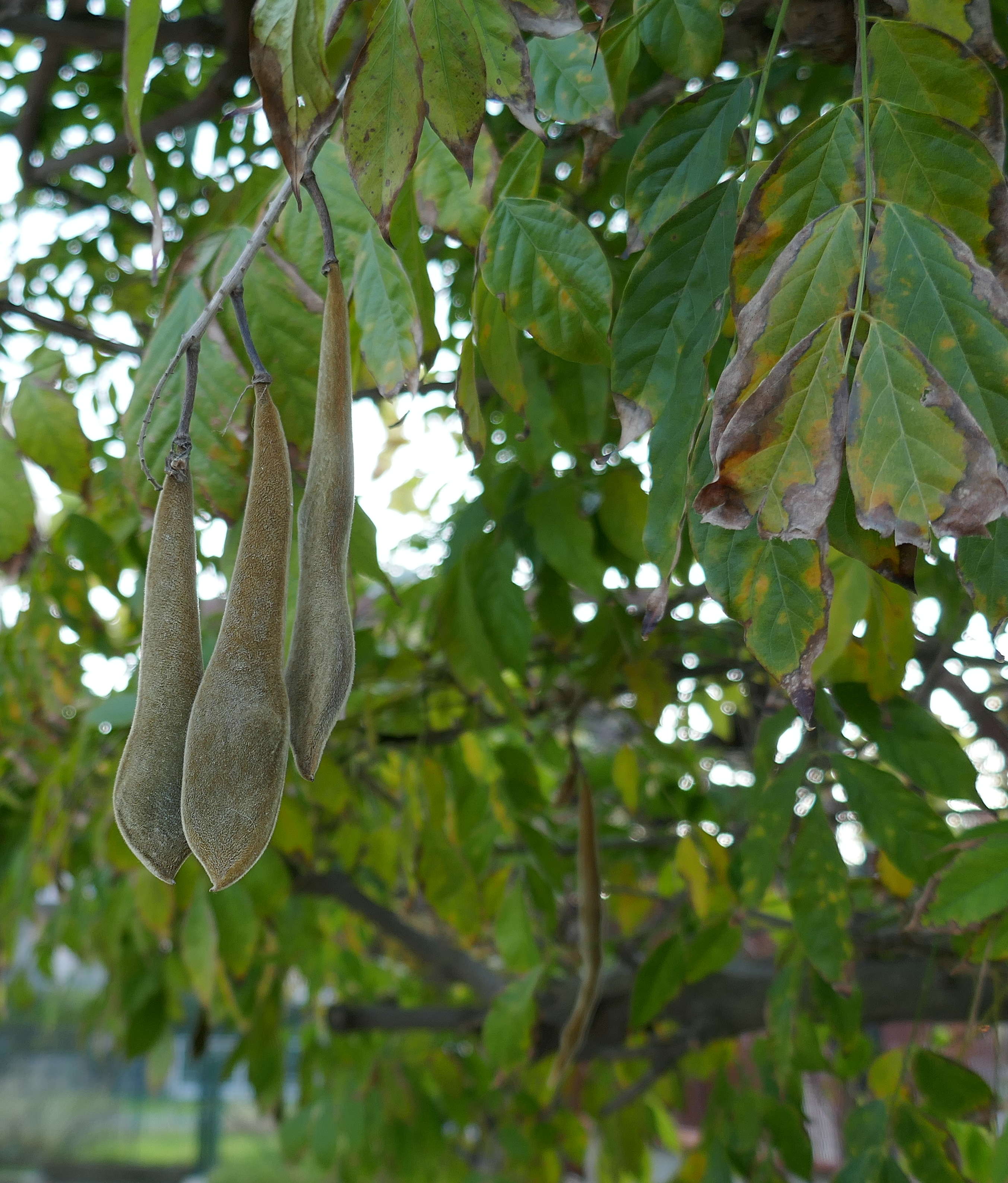 gli altri baccelli a sx (stessa pianta) mi hanno ricordato le carrube (Ceratonia_siliqua), ma sono dubbioso.